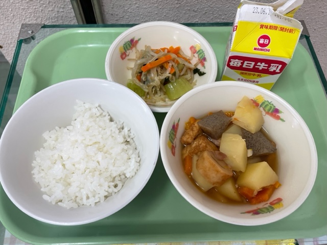 今日の給食は関東煮、三色ナムル、ごはん、牛乳でした。