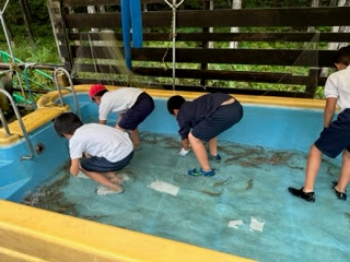 昨夜の雨のため、川が増水しているので、安全を優先して、プールで魚つかみをしています。